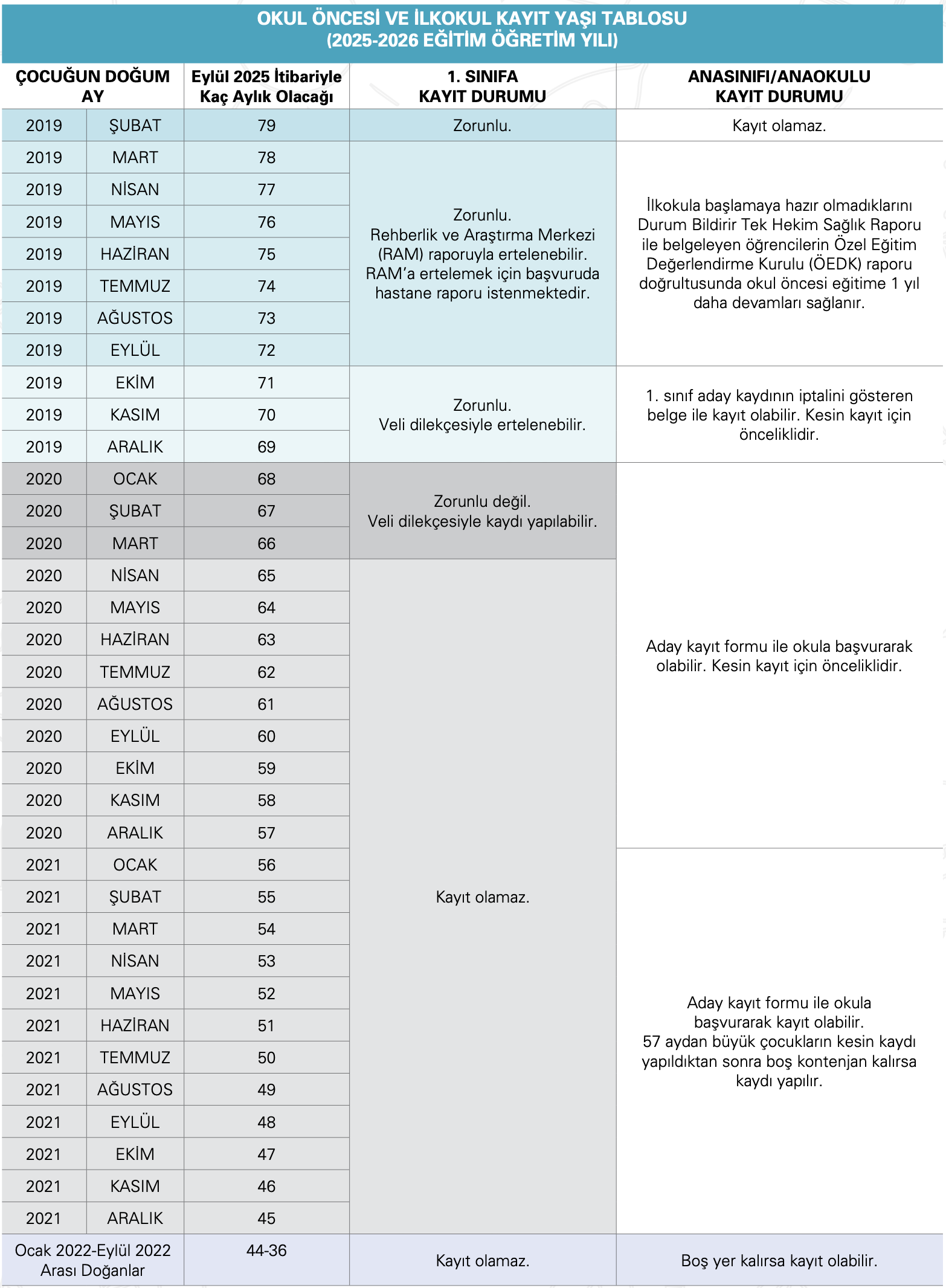 Çocuklar 36 aylıktan itibaren anaokuluna devam edebilirler. 69 aylık (5,5 yaşında) çocuklar 1. sınıfa kaydolmalıdırlar. 2025-2026 eğitim öğretim yılı okula başlama yaşı Eylül sonu itibariyle hesaplanmaktadır (30/09/2025). Çocuğun hangi sınıfa kaydolabileceğini öğrenmek için bu bağlantı kullanılabilir.